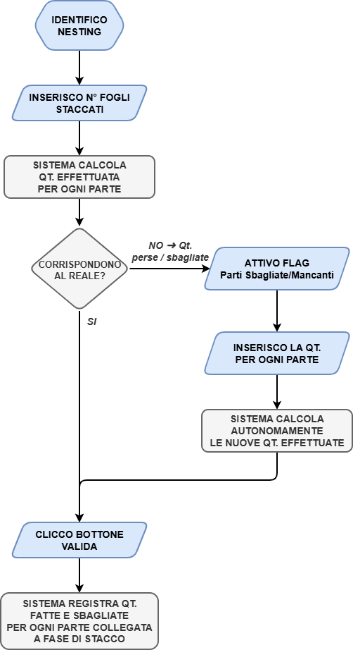 Il sistema aggiorna automaticamente i dati della fase, garantendo coerenza tra nesting, produzione e tracciabilità.